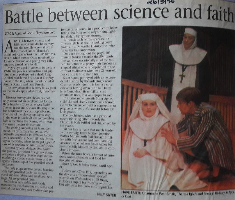 The clipping above, printed in The Mercury on March 26, 1996, is my review of James Pilemeier’s Agnes and God, which ran in Durban a year after the film version starring Jane Fonda, Anne Bancroft and Meg Tilly. The stage production here, directed by Murray McGibbon, teamed (from left in the picture above) Charmaine Weir-Smith,Theresa Iglich and Shelagh Holliday).