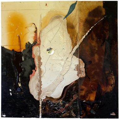 “Often smaller, individual pieces become incorporated into bigger pieces, resulting in multifacets of meaning and imagery. Some pieces evolve over many months, even years, the intentional ageing and deterioration of substances and materials manifesting the creative process over time.”