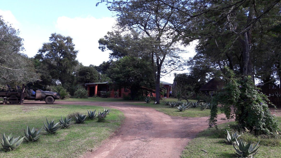 The game drive pick-up area at the tented camp at Thula Thula. The main building with the bar, lounge and diningroom is to the left. To the right is the outdoor pub and boma.