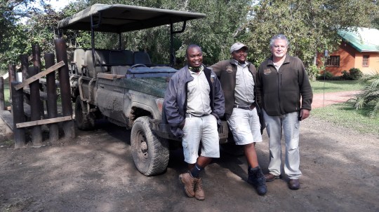 The call of the wild… game guards Siya and Muzi with Thula Thula Tented Camp manager Christian.