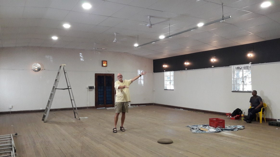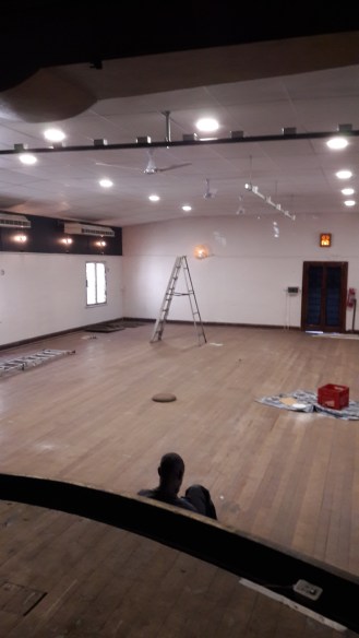 A visit to the venue today – the theatre is in the Rhumbelow Shellhole – shows, after roof repairs, a new, bright, white ceiling with four new white ceiling fans having replaced the old metal fans. The ceiling’s dated, old fluorescent light fittings have given way to 10 circular lights built into the ceiling.