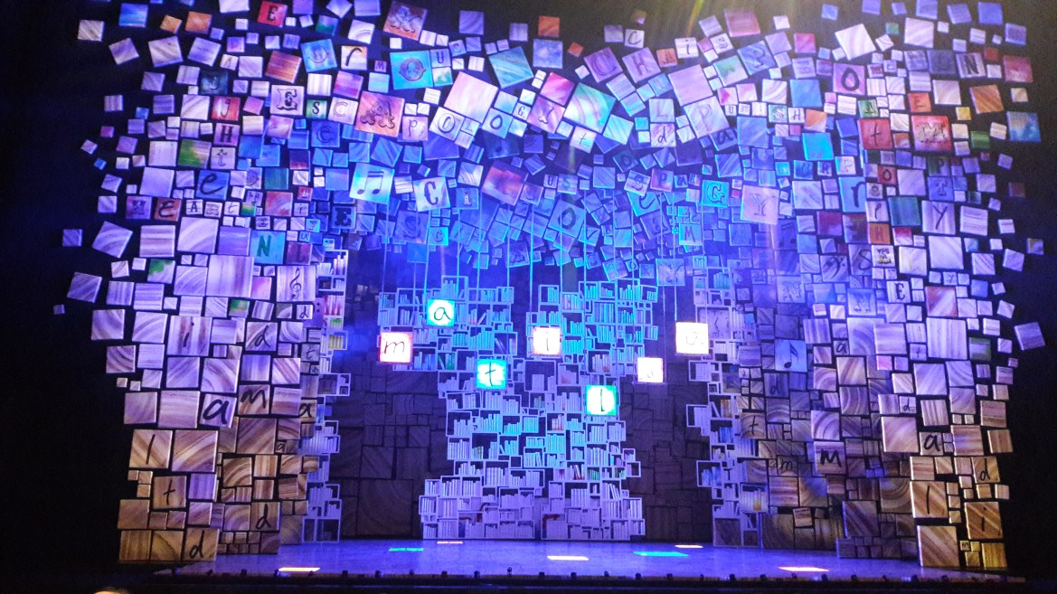 It is jaw-droppingly impressive – a collage of countless suspended Scrabble-like squares and blocks that seem to dangle in mid-air and extend the full width of the stage. Many contain letters in different colours and fonts. At the stage’s centre are suspended illuminated letters spelling out the show title in front of a depiction of towering, wonky shelves filled with books.