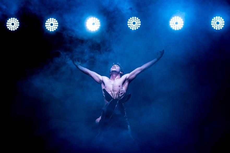 Nugget, the stallion with which Alan forms a very close bond, is particularly well depicted by tall and toned Len-Barry Simons. With his midriff and back bare, he majestically towers above others on stage in a frame-structured horse mask and raised metallic footwear depicting hooves. He exudes a homoerotic energy and comes across as all-powerful, eerily enigmatic, as he poses with the grace and style of a dancer.