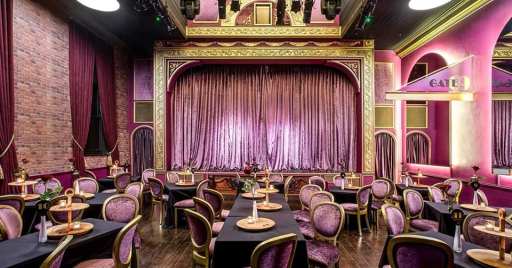 The venue, which seats only 80 to 100 people at tables in front of an ornately decorated stage proscenium, has seating in a small upstairs area as well as downstairs, reserved for “business” and “first class” patrons.