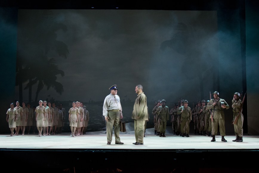 The show opens with the rousing overture providing a backdrop to footage of the written words of James Michener’s description of the South Pacific islands. Special mention to video designer Kirsti Cumming for this and for providing other subtle, impressive AV moments including bobbing waves and, in one striking scene, the arrival of war ships.